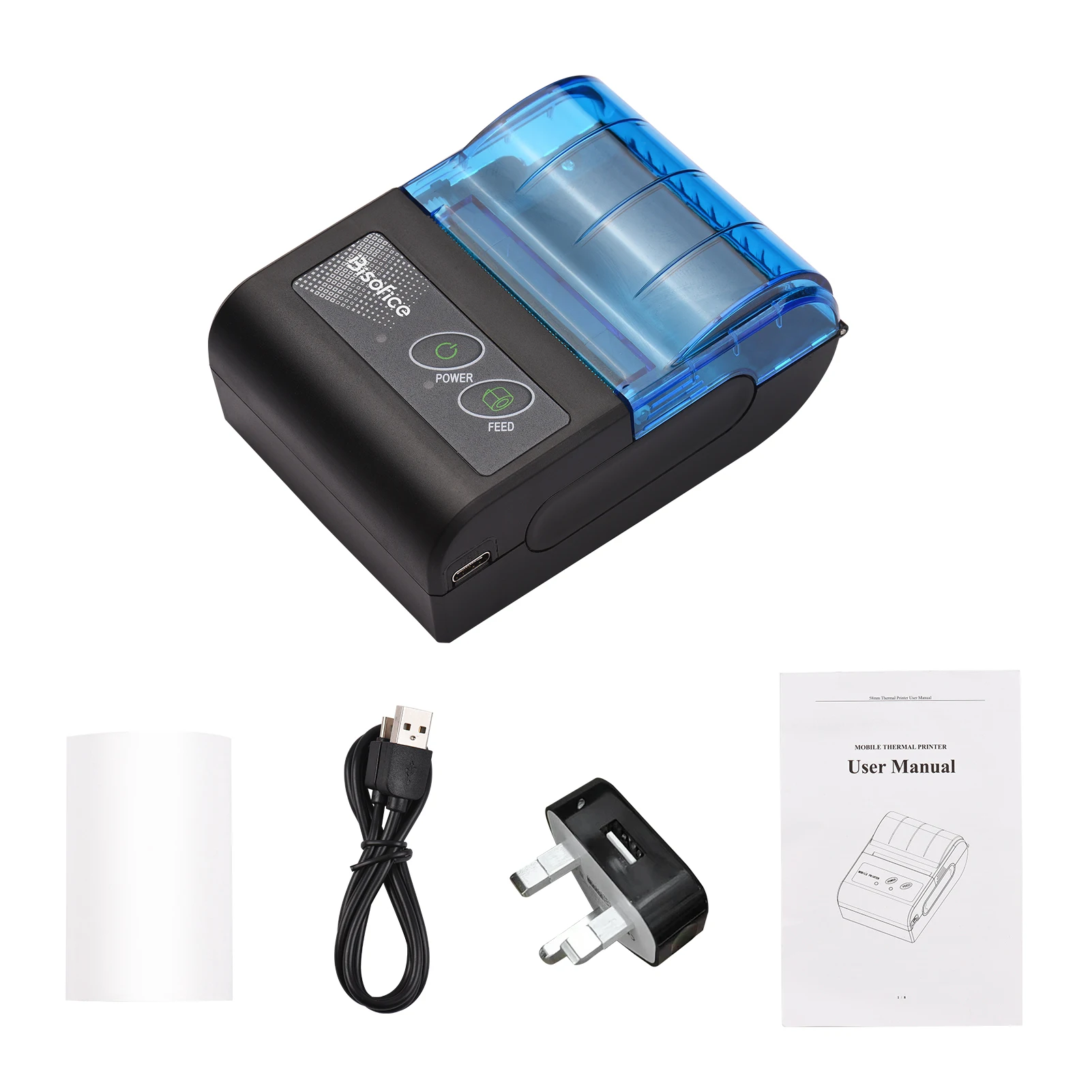 1. Impressora de recibos térmica Mini BT, largura do papel 58mm, largura de impressão válida 48mm, velocidade máxima 70 mm/s, resolução 203dpi.